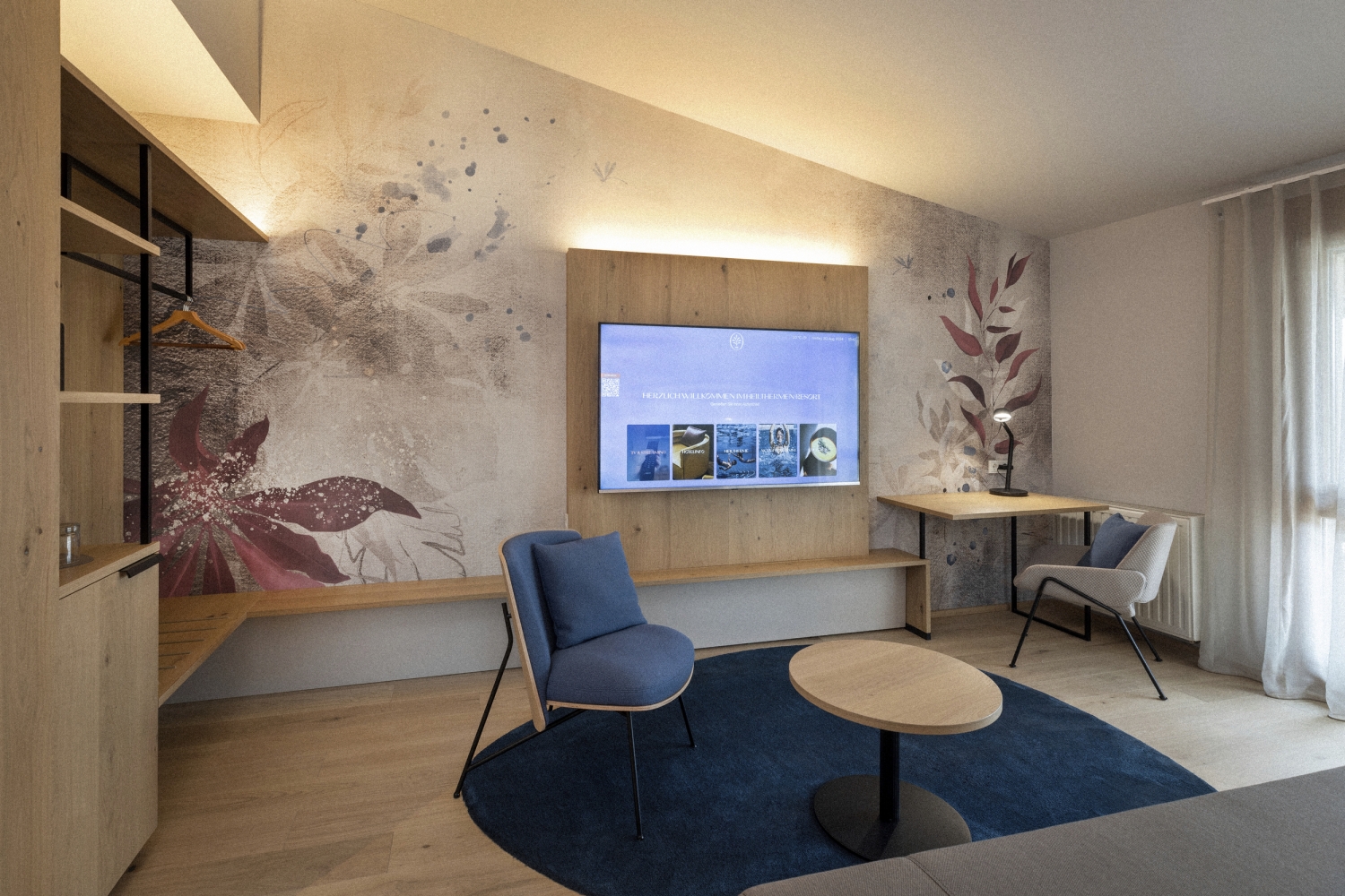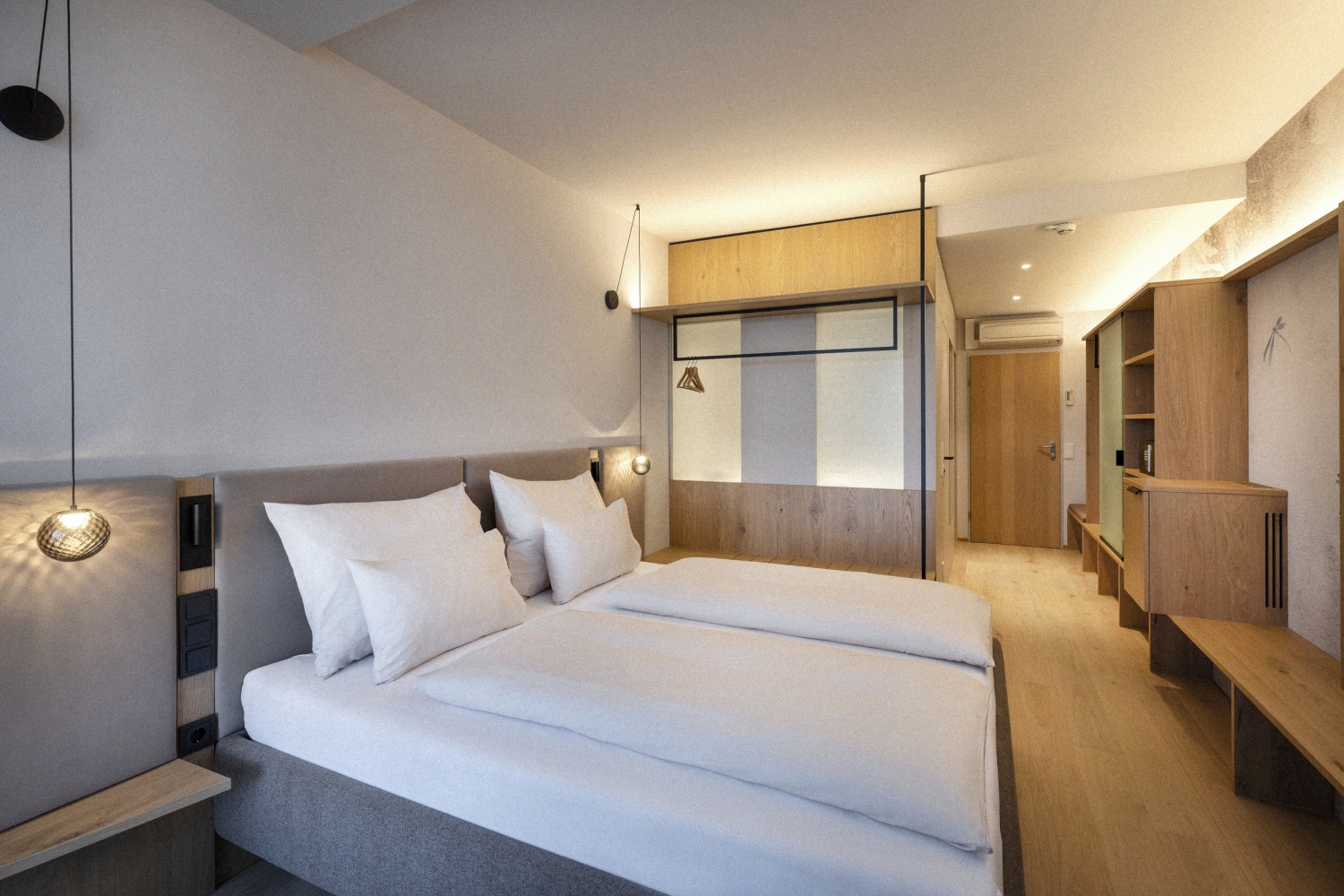 Die 183 top-ausgestatteten Zimmer (20-25 m2) und Suiten (40-50 m2) sind in angenehmen Farben mit Vollholzmöbeln und bioversiegelten Parkettböden eingerichtet und verfügen über Dusche/WC, Föhn, Badetasche mit Leihbademantel und Badetüchern, Klimaanlage, Infotainment System mit 50“-TV und Streaming Möglichkeit, Safe, Minikühlschrank, WLAN, Balkon oder Terrasse. Die ausgezeichneten Superior-Zimmer bestechen durch natürliche Materialien, stilvolle Möbel und höchsten Wohnkomfort. Doppelzimmer (Typ DA3) mit Balkon oder Terrasse, ca. 25m². Einzelzimmer (Typ EA2) mit Balkon, ca. 20m². Einzelzimmer Superior (Typ ED1) mit Balkon, ca. 21m². Doppelzimmer Superior (Typ DD2) mit Balkon oder Terrasse, ca. 25 m². Die m² Angaben der Zimmer beziehen sich auf Wohnfläche inkl. Sanitär exkl. Balkon.