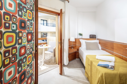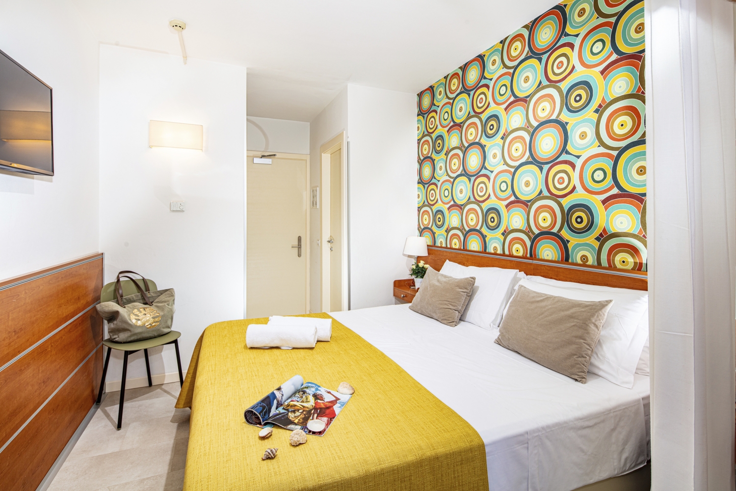 Alle 62 Zimmer mit Dusche/WC, Föhn, Telefon, Klimaanlage, Sat-TV, W-LAN (ohne Gebühr), kleiner Kühlschrank. Doppelzimmer Classic Typ DA3: ca. 15m², 1 Zusatzbett möglich. Doppelzimmer Classic Typ DB3: ca. 15m², mit Balkon, 1 Zusatzbett möglich. Einzelzimmer Superior Typ EA1: ca. 10 m², teilweise mit Balkon. Doppelzimmer Classic Typ DA2: ca. 12 m². Gitterbett anmeldepflichtig, ca. €15,- pro Tag vor Ort.