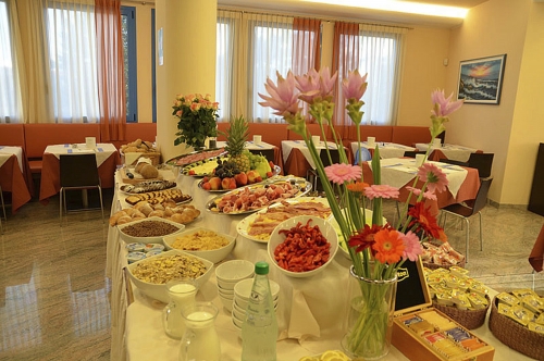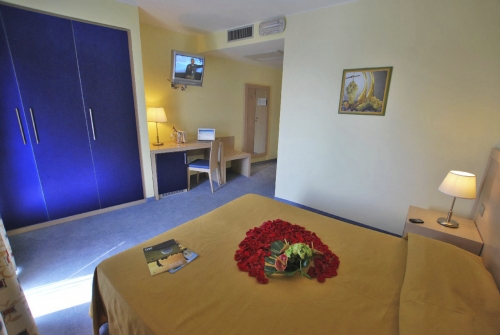 Alle 54 Zimmer mit Dusche/WC, Föhn, Klimaanlage, Sat-TV (ca. 2 dt. Progr.), Telefon, W-LAN (ohne Gebühr), Minibar (unbefüllt) und Balkon. Doppelzimmer Typ DA2: ca. 18-21m², Typ DT3: Doppelzimmer mit Zusatzbett. Alle m² Angaben beziehen sich auf den Wohnfläche, mit Badezimmer und ohne Balkon. Gitterbett anmeldepflichtig, ca. €15,- pro Tag vor Ort.
