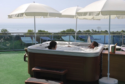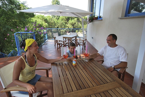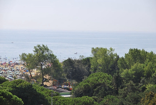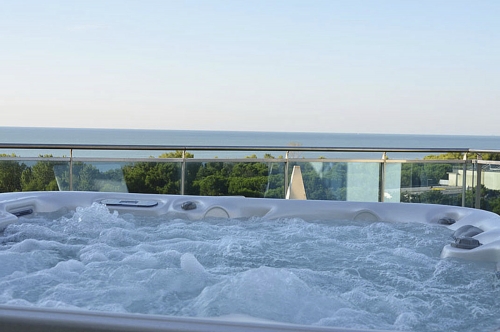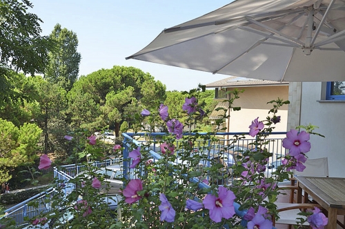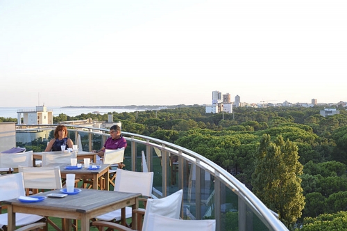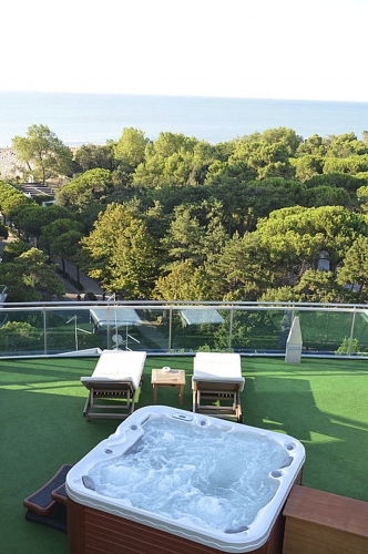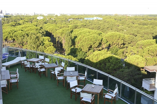 Lobby mit Rezeption, Aufzug, Bar, Speisesaal, beheizter Whirlpool und Sonnenterrasse mit Meerblick im 5. Stock, Liegebetten nach Verfügbarkeit, ohne Gebühr. Parkplätze nach Verfügbarkeit, ohne Gebühr. Parkplatz nach Verfügbarkeit, ca. €12 pro Tag, Juli und August ca. €15 vor Ort. Kleine Haustiere auf Anfrage erlaubt, ca. €10,- pro Tag vor Ort (ohne Futter).