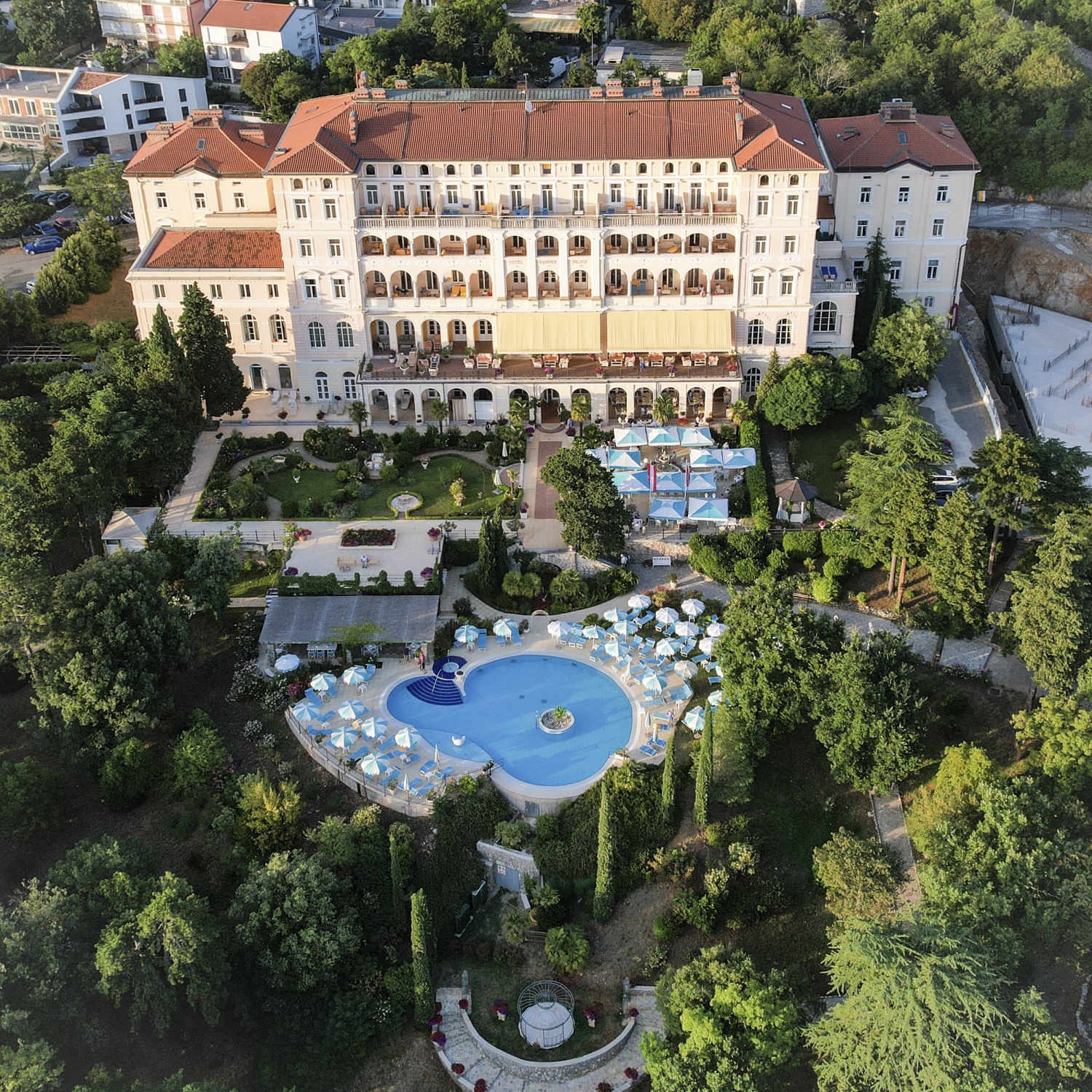 Das Hotel befindet sich ca. 700m vom Zentrum und ca. 250m vom Meer entfernt. Das Hotel thront auf einer Anhöhe, eingebettet in einen 30.000 m² großen Gartenpark mit